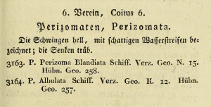 Von der Abkürzung „P.“ hinter der laufenden Nummer 3163 in Hübner ([1825]: 327) darf man sich nicht irritieren lassen; die Abkürzung ist wohl als Druckfehler hineingeraten und zu streichen. Hübner ging in seinem „Verzeichniß bekannter Schmettlinge“ beim Aufstellen der Gattungsnamen durchgehend nach demselben Prinzip vor: Im groß gedruckten Teil der Überschrift zu jeder Gattung steht links der Gattungsname im Nominativ Plural der deutschen Grammatik (hier: Perizomaten) in Frakturschrift, dann nach dem Komma der wissenschafliche Name im Nominativ Plural, entweder in lateinischer oder altgriechischer Sprache (hier altgriechisch: Perizomata) in lateinischen Buchstaben. Daraus lässt sich der Singular Perizoma herleiten, der ja hier dann auch, wie immer, vor dem ersten Art-Epitheton steht; erst ab dem zweiten wird der Gattungsname zur Initiale abgekürzt.