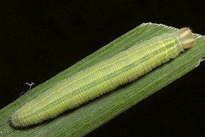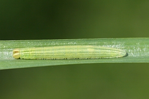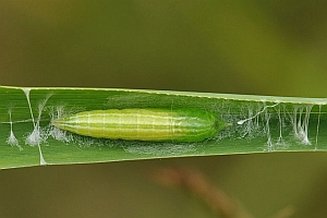 Die Eiablage erfolgt in die Blattscheiden von Gräsern in bis zu diesem Zeitpunkt noch ungemähten oder besser mehrjährig ganz brachliegenden Wiesen oder sonstigen Grasstreifen bzw. extensiv beweidetem Grünland. Die Eier (oder genauer: die Räupchen im Ei) überwintern und können in dieser Zeit mit Heuballen auch verschleppt werden. Mehrschürig gemähte Wiesen sind für die Art ungeeignet. Am meisten genutzt werden einige produktive, breitblättrige Gräser, allen voran Kriech-Quecke und Land-Reitgras, aber auch Wiesen-Knäuelgras und Wiesen-Lieschgras und viele andere Arten (sicher noch weitere als die hier angeführten!).