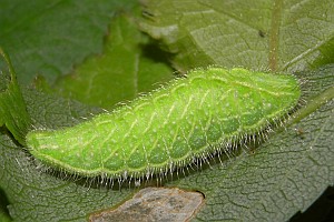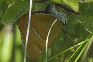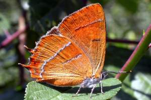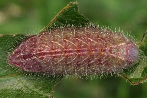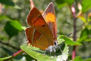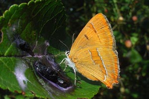 Was hat es mit Angaben zu Birke, Hasel und Rotbuche auf sich ? Sie sind entweder falsch oder spielen eine völlig zu vernachlässigende Rolle. Ich schrieb in Ebert & Rennwald (1991: 165-11): "Daß wir diese dudiosen Futterpflanzen jedoch nicht einfach allesamt über den Haufen werfen dürfen, zeigt uns im Nachhinein eine Eiablagemeldung aus unserem eigenen Gebiet: W. Nowak beobachtete in seinem Hausgarten in Weilderstadt-Ostelsheim ein eierlegendes Weibchen und fotografierte anschließend ein Ei -an Birke! Wird Betula pendula (oder sogar Betula pubescens) doch ab und zu belegt ? Wir wissen es nicht." Da die Raupe damals nicht mit Birkenblättern durchgezüchtet wurde, könnte es sich auch um eine reine Fehlablage gehandelt haben. Belege für eine Nutzung von Birken oder anderen Betulaceae oder Fagaceae durch die Raupen von Thecla betulae gibt es jedenfalls nicht. Dass es zu Fehlablagen kommen kann, erwähnten auch Koschuh et al. (2005: 49) für die Steiermark: "Ausnahme war ein Eifund an Kreuzdorn (Rhamnus spec.)."
