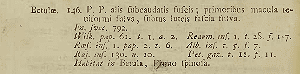 - Bezug einer Indikation in der Erstbeschreibung: Albin, E. (1720): A Natural History of English Insects. Illustrated with A Hundred Copper Plates, Curiously Engraven from the Life: And (for those who desire it) Exactly Coloured by the Author: [I]-[XIII], not paginated text page for each plate, pl. I-C. London.