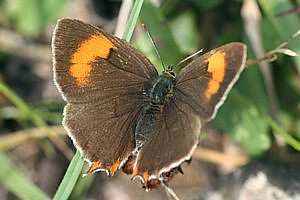 Fartmann & Timmermann (2006: 131) gehen aber doch von einer Bevorzugung jüngerer Pflanzen aus, die nicht von der Hand zu weisen ist: "The general preference for young plants, young projecting growth or young suckers is well documented by Thomas (1974). He showed that shoots younger than 6 years but older than 1 year are preferred for egg-laying. Most eggs were found on 4 years old shoots. Only P. spinosa plants older than 6 years are able to produce flowers. Epicormic growth can start flowering two years after coppicing (Hermann pers. comm.). The preference for young shoots in the study area would have been far more striking if the surface had also been taken into account. The bark surface area of an old bush may present the 100-fold of that of a young plant (Thomas 1974). In contrast to this Ebert & Rennwald (1991) state that most larvae and eggs were found on older specimen of P. spinosa and that this applies to Baden-Württemberg in general. According to our study and further own observations, females use old P. spinosa plants for oviposition if they have no other choice. However, if young suckers a few years after coppicing are present, females will clearly prefer these plant individuals. Egg densities on old shoots will usually never reach the values of the young shoots. Hermann (pers. comm.) also found a preference for young growth in Baden-Württemberg." Dem kann ich aus heutiger Sicht durchaus zustimmen.