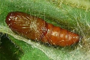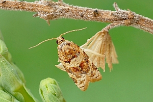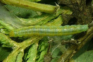 Vor diesem Hintergrund ist es schwer, an einzelnen Pflanzen der Auflistung von Kennel (1910: 164-165) zu "Tortrix politana Hw." zu zweifeln: "Die Raupe ist grün mit weißlichen Wärzchen, der Kopf bräunlichgrün, Nackenschild gelblichgrün. Sie lebt in zwei Generationen im Juni, dann im Juli bis September zwischen versponnenen Blättern oder Blüten von Centaurea jacea, Clinopodum, Erica, Calluna, Ledum palustre, Potentilla fragaria [war hier Potentilla fragariastrum, jetzt Potentilla sterilis gemeint ?], Ranunculus acris, Senecio jacobaea, Vaccinium myrtillus und uliginosum, Genista, Prunus.