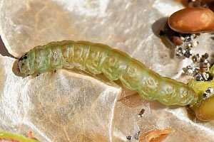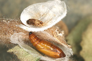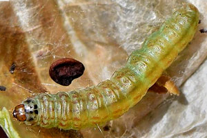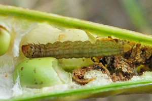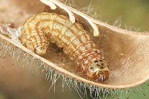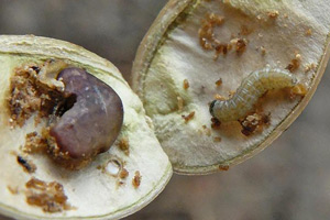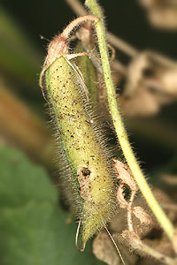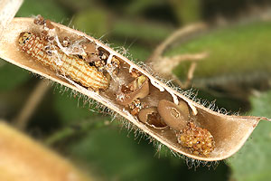 Den Befall einer Pflanze erkennt man an den runden Ausstiegslöchern der Raupen in den Hülsen.