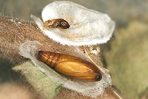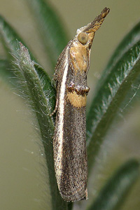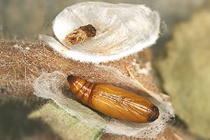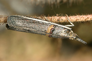 Etiella zinckenella entwickelt sich als Raupe in den Hülsen einer ganzen Reihe von Schmetterlingsblütlern/ Hülsenfrüchtlern (Fabaceae). Mit obigen Bildern aus dem Wallis hat R. Bryner die Rundblättrige Hauhechel (Ononis rotundifolia) als Nahrungspflanze dokumentiert. Bei Mörtter et al. (2018) heißt es ebenfalls zum Wallis (war das eine gemeinsame Exkursion?): "Seliger fand die Raupen in der Schweiz/ Wallis in den Hülsen von rundblättriger Hauhechel (Ononis rotundifolia)." In der Literatur und im Internet finden sich fast ausschließlich Angaben zu Pflanzen mit bohnenartigen Früchten - und da davon weltweit sehr viele Arten angebaut werden, ist auch die Liste der Nahrungspflanzen von E. zinckenella lang - die meisten dieser Angaben dürften auch tatsächlich stimmen - meist wird E. zinckenella dabei als landwirtschaftlicher Schädling bezeichnet.