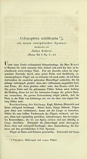 - Erstbeschreibung: (1899): Lederer, J. (1862): Celonoptera mirificaria, ein neuer europäischer Spanner. — Berliner Entomologische Zeitschrift 6: 59-60 + pl. 1 fig. 1-4.