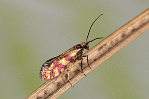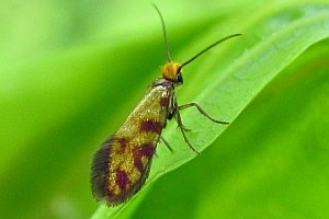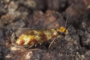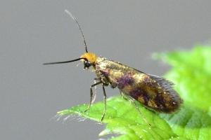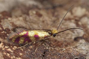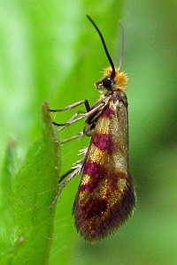 Vorderflügel purpurrot mit matt goldener Zeichnung; Kopf gelb.