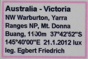 1: ♀, Australia, Victoria, NE Melbourne, Yarra Ranges NP, Mt. Donna Buang, 1100 m, 21. January 2012, lux; (det. & phot.: Egbert Friedrich)