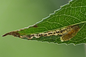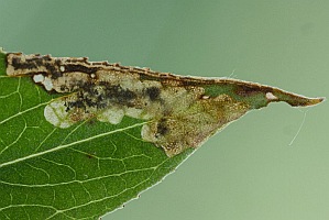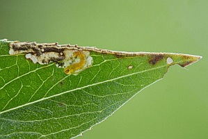 Nach Johansson et al. (1990) minieren die Raupen in Blättern schmalblättriger Weiden: Bruch-Weide (Salix fragilis), Lorbeer-Weide (Salix pentandra), Silber-Weide (Salix alba), Trauer-Weide ("Salix babylonica") und Korb-Weide (Salix viminalis), gelegentlich noch weiterer Weiden-Arten. [Bladmineerders.nl] nennt noch Salix x chrysocoma [= Salix babylonica x Salix alba] (Dotter-Hänge-Weide) und Salix triandra (Mandel-Weide).