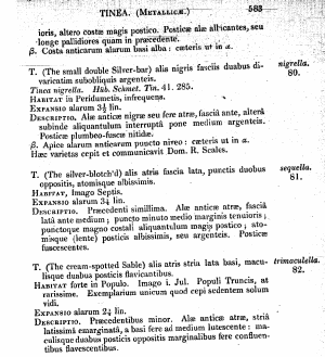 - Stainton, H. T. (1855): The Natural History of the Tineina. Volume I. Containing Nepticula. Part I. Cemiostoma. Part I: I-XV, 1-338, Nepticula pl. I-VII, Cemiostoma pl. I. London (John van Voorst), Paris (Deyrolle), Berlin (E. S. Mittler und Sohn). — Digitalisat auf archive.org: [216], [pl. VI (fig. 1)].