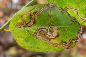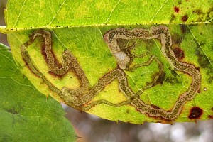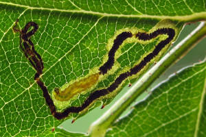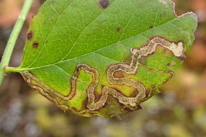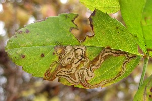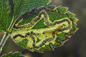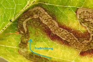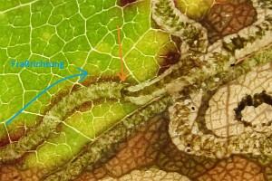 Der Kot wird meist in spiraligen Windungen abgelegt, bei der Verwechselungsart Stigmella centifoliella jedoch nicht. An einer bestimmten Stelle der Mine (vermutlich im Zusammenhang mit einer Raupenhäutung) wechselt die Kotlinie plötzlich ihr Aussehen (in den folgenden 3 Bildern mit einem roten Pfeil gekennzeichnet).