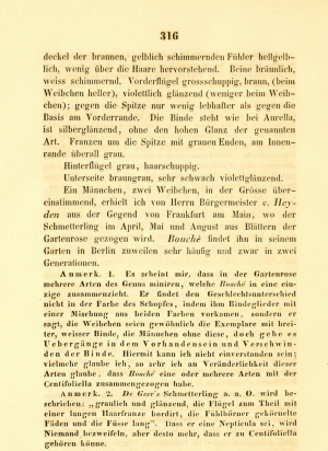 - Stainton, H. T. (1862): The natural history of the Tineina 7: I-IX, 1-251, Bucculatrix pl. I-IV, Nepticula pl. VIII-XI. London (John van Voorst) – Paris (Deyrolle) – Berlin (E. S. Mittler und Sohn). — Digitalisat auf archive.org: [204-211], [Nepticula pl. X fig. 1].