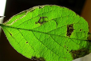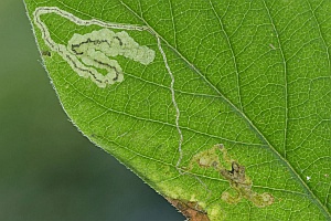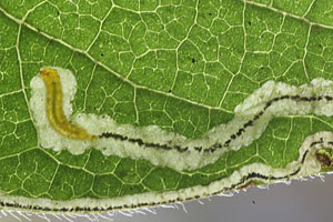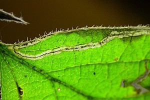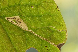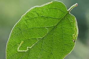 Die Mine verläuft fast unsichtbar von der Blattspitze bis zum Stielansatz. Erst dort erweitert sie sich. Ab diesem Zeitpunkt ist sie am Strauch einigermaßen zu erkennen. (Uwe Büchner)