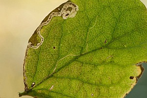 4-5: leere Mine in Blatt von Gemeiner Heckenkirsche (Lonicera xylosteum): Deutschland, Thüringen, an die Neuberghutung bei Wiesenthal/Rhön angrenzendes, dunkles Waldstück, 12. Oktober 2014 (leg. det. und Fotos: Uwe Büchner)Forum