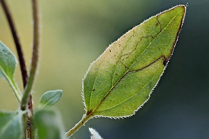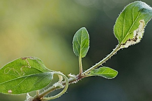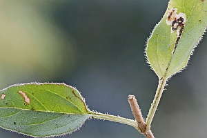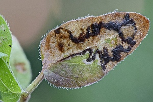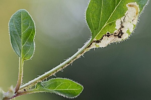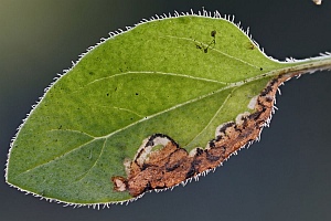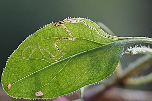 Nach Johansson et al. (1990) lebt die Raupe in Blattminen an Braunellen: Prunella vulgaris (Gewöhnliche Braunelle), Prunella grandiflora (Großblütige Braunelle) und Prunella laciniata (Weiße Braunelle); in Mitteleuropa ist sie demnach am häufigsten an Pflanzen der Großblütigen Braunelle zwischen hohen Gräsern zu finden.