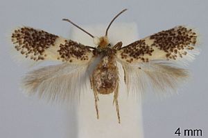 Die Erstbeschreibung der Art (Groschke 1944) enthielt gleich eine schöne Skizze zu den typischen Blattminen - hier an Flaum-Eiche (Quercus pubescens). Die Artseite auf Blaadmineerders.nl [Artseite auf bladmineerders.nl] listet gleich eine ganze Reihe von Eichen-Arten auf, in deren Blättern die Minen gefunden wurden: Quercus coccifera (Kermes-Eiche), Quercus frainetto (Ungarische Eiche), Quercus macrolepis (Wallonen-Eiche), Quercus petraea (Trauben-Eiche), Quercus pubescens (Flaum-Eiche), Quercus pyrenaica (Pyrenäen-Eiche), Quercus robur (Stiel-Eiche). Zur Gall-Eiche siehe obige Diagnose-Bilder.