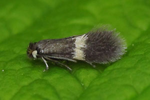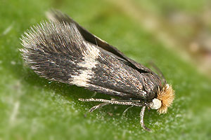Spannweite 5 - 7,5 mm; Kopfhaare und Halskragen gelb bis schwarz; Vorderflügel glattschuppig, schwarz, ohne Schuppenlinie; Querbinde gelblichweiß; Vorderflügelunterseite am Vorderrand mit Feldchen von weißen Schuppen (undeutlich); Haarpinsel lang, weiß [nach Laštůvka (1997)]