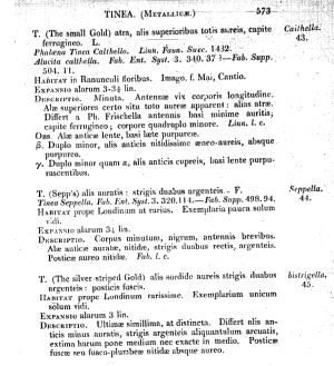 - Stainton, H. T. (1873): The natural history of the Tineina 13: I-VIII, 1-377, pl. I-VIII. London (John van Voorst) – Paris (Deyrolle) – Berlin (E. S. Mittler und Sohn). — Digitalisat auf archive.org: [32-41], [pl. I fig. 2].