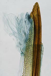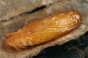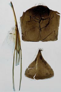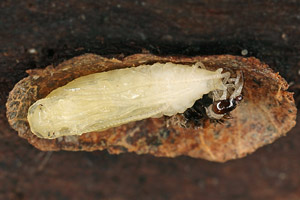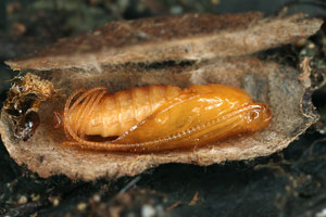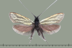 Anlässlich einer Routinekontrolle stellte ich fest, dass im Innern eines Raupengehäuses soeben die Verpuppung im Gange war. Diese Gelegenheit wollte ich nicht verpassen und öffnete das Gehäuse vorsichtig. Der Verpuppungsvorgang war unterdessen fast abgeschlossen. In den unten gezeigten Bildern ist deutlich erkennbar, dass die überlangen Fühlerscheiden in einem Knäuel in der Raupenkopfkapsel untergebracht sind. Durch kreisende Bewegungen des Puppenabdomens werden die Fühlerscheiden langsam aus der Kopfkapsel herausgezogen und gleichzeitig um das Abdomenende gewickelt. Dieser Vorgang war im geöffneten Raupensack natürlich nicht so erfolgreich, weil der erforderliche Widerstand durch die Enge des geschlossenen Gehäuses fehlte. Trotzdem gelang es der Puppe, die Fühler nach und nach um den Hinterleib zu wickeln (Bilder 2-6 unten).