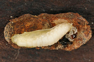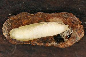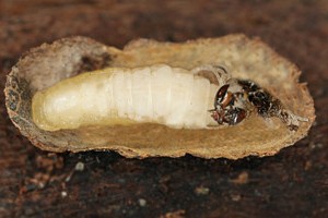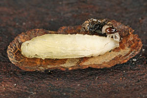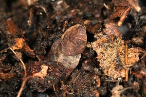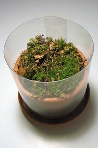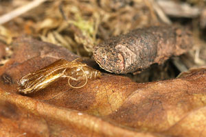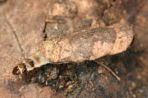 Die Raupen wurden in Blumentöpfe gegeben, die mit Erde und Bodenstreu vom Fundort aufgefüllt worden waren (Bild 1 unten). Diese Behälter stellte ich, oben mit Gazestoff verschlossen, ins Freie. Einige dieser Gefässe holte ich Ende Januar ins Zimmer. Die Raupengehäuse enthielten zu diesem Zeitpunkt alle noch die Raupen; einige der letzteren wurden dann wieder aktiv. Andere Gehäuse steckten annähernd senkrecht im Erdreich und enthielten bereits eine Vorpuppe (Raupenbild 3).