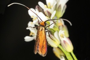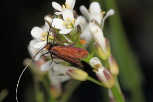 R. Bryner und Schmid (2019: 54) gelingt die Klärung der Biologie der Art: "Eiablage und erste Raupennährpflanze ist die Rauhaarige Gänsekresse (Arabis hirsuta) (1) und vermutlich auch das Brillenschötchen (Biscutella laevigata). Die weiblichen Falter stechen mit ihrem Hinterleibsende durch die Wand der unreifen Samenschote (2). Dann legen sie ein elliptisches, glattschaliges Ei ins Schoteninnere in die Nachbarschaft eines Samens (3, 4). Die Raupe schlüpft nach einer Woche und frisst die jungen Samen (5). Nach der ersten Häutung frisst sie ein Loch in die Schotenwand, drückt zusammengesponnenen Kotballen heraus und fertigt sich daraus ihren ersten Sack (6). Darin fällt sie zu Boden und erweitert den Sack vorne und hinten (7, 8). [...]" Die Ziffern stehen dabei für qualitativ hochwertige Fotos, die das erläutern. Nach Schmid (2019: 54) kommt es teilweise zu zweijähriger Larvalentwicklung. Wie auch bei anderen Adeliden erfolgt die Verpuppung im Spätfrühling.