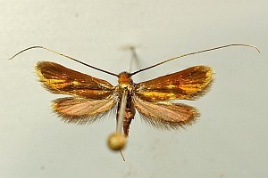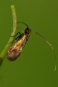 - Flügelglanz bronzefarben bis leicht grünlich (Nemophora metallica mehr kupferig oft mit hellen Schuppen überflogen; Adela reaumurella stark grün-glänzend).