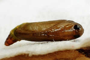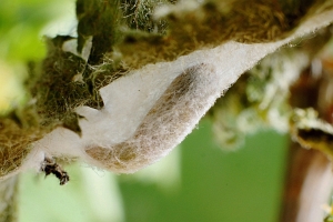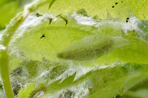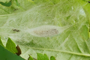 Auch bei Agassiz (1996: 60) bleibt Sorbus aucuparia wichtigste Eiablagepflanze: "Ovum. Laid on rowan (Sorbus aucuparia), or sometimes hawthorn (Crataegus spp.) [...] Larva. [...] Overwinters as a small larva in a dense white cocoon. In spring, feeds in a loose web on the leaves, often two or three larvae in each web. The webs are normally within one metre of the ground. Seedling trees in open woodland are preferred (Agassiz, 1984)." Agassiz (1984: 12-13) hatte für England das Schema von Schütze bestätigt, wonach die Raupen nur an kleinen, eher schattig stehenden Sorbus aucuparia zu finden sind - Crataegus nannte er (noch) nicht.