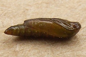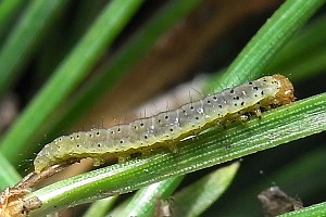 Schon von Heyden (1865: 106) konnte berichten: "Raupe spindelförmig; die Segmente etwas eingeschnürt, glänzend, einfarbig meergrün. Vor der Verwandlung zeigen sich gewöhnlich drei dunklere Längslinien. Kopf klein, herzförmig, glänzend, bernsteingelb mit dunklerem Mund. Nackenschild gelblichgrün. Letztes Segment gelblich mit zwei kurzen Spitzen. Vorderbeine gelblich, mit dunkleren Krallen. Sie findet sich nicht selten bei Frankfurt Mitte Mai an Kiefern. (Pinus sylvestris.)"