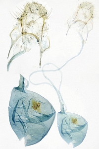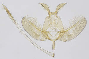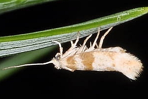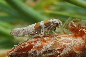 Die Eiablage erfolgt an eine Nadel und die Raupe miniert erst einmal in dieser; bladmineerders.nl formuliert dazu: "A relatively large, ribbed, oval egg is deposited near the base of the needle, on the outer, convex, side. The emerging larva at first makes a wavy, epidermal, corridor, running in the direction of the needle tip. Soon the gallery becomes deeper and fills the entire needle. The larva works itself to close to the tip of the needle; the mine behind it is almost completely filled with frass. Pupation external; the exit opening is just under the tip, in the flat side of the needle."