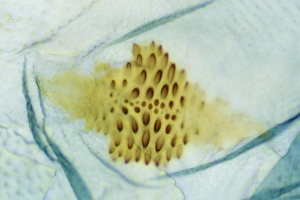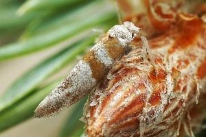 Schütze (1931) schreibt knapp: "In lockerem Gespinst zwischen den Nadeln von Pinus silvestris und Pinus montana (Wocke)." Die Wald-Kiefer kann durch den oben gezeigten Fund von Heidrun Melzer bestätigt werden. In der Literatur werden noch einige weitere Kiefern-Arten genannt, vor allem die aus Nordamerika stammende und in England und Skandinavien forstlich angebaute Küsten-Kiefer (Pinus contorta).
