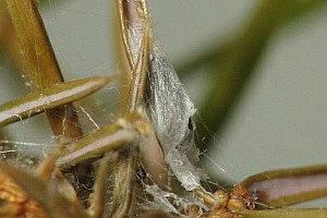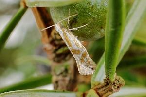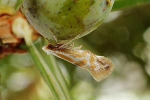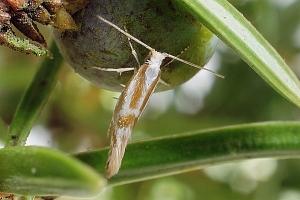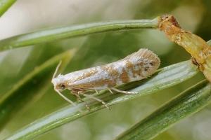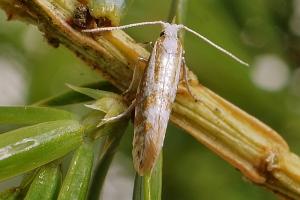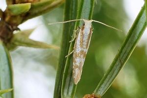 Die Raupe miniert in den Nadeln von Wacholder (Juniperus communis).