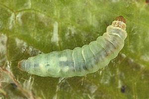 Schütze (1931: 119) teilt zur Raupe mit: "In den Blütenknospen von Prunus cerasus (Sorhagen), Schlehen- und Weißdornknospen (Disqué), in zusammengezogenen Triebenden von Prunus-Arten, besonders Kirschen (Rössler), ich finde sie auch zwischen den jüngsten noch nicht entfalteten Kirschblättern (Schütze)." Angaben zu Crataegus beruhen wahrscheinlich auf Verwechslung.