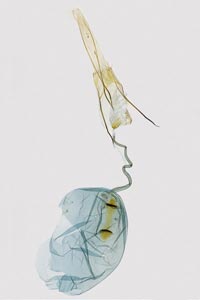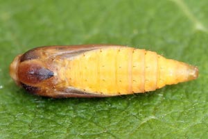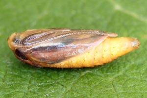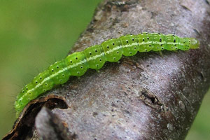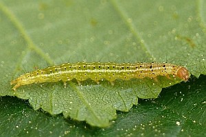Die Raupe von Ypsolopha parenthesella unterscheidet sich insbesondere durch den mehr einfarbigen hellbraunen Kopf sowie die dicken schwarzbraunen Punkte auf den ersten Segmenten und die kontrastreicher gezeichnete Nackenplatte von den ansonsten sehr ähnlichen Ypsolopha sylvella und Ypsolopha alpella. (Heidrun Melzer)
