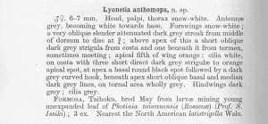 - Kuroko, H. (1964): Revisional Studies on the Family Lyonetiidae of Japan (Lepidoptera). — Esakia 4: 1-61, pl. 1-17 [hier: 26-28] [PDF auf catalog.lib.kyushu-u.ac.jp].