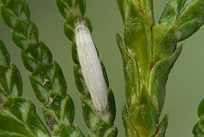 Die Raupe wurde nach Nieukerken et al. (2012) in Europa bisher nur in Blattminen der amerikanischen Roteiche (Quercus rubra) gefunden. In Nordamerika miniert sie an eben dieser Pflanze und an der in Europa nur selten in Parks gepflanzten Färber-Eiche Quercus velutina ("eastern black oak"), vereinzelt auch an Quercus montana. Angaben zu Eichen aus anderen Verwandtschaftskreisen oder gar zur Kastanie (Castanea sp.) bedürfen der Überprüfung.