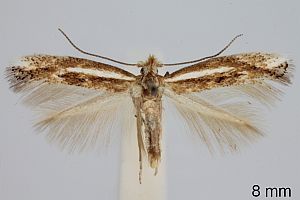 Genau dies ist dann auch passiert, und so kann Michael Kurz auf seiner Seite [am 17. August 2016] unter der Überschrift "Bucculatrix chrysanthemella Rebel, 1896 neu für Österreich" berichten: "Bucculatrix chrysanthemella ist ein Endemit der Kanarischen Inseln, deren Raupen sich auf Strauchmargeriten entwickeln (Argyranthemum-Arten und Gonospermum fruticosum, siehe Lepiforum 2016). Mit Argyranthemum-Hybriden wurde die Art in den letzten Jahren in mehrere west- und nordeuropäische Länder verschleppt. Erstmals wird nun die Art auch aus Mitteleuropa gemeldet." Konkret heißt es weiter: "Am 9.7.2016 leuchtete ich in meinem Garten am Stadtrand von Salzburg, wo ich bereits in den letzten Jahren mehrmals neue Arten für das Bundesland Salzburg feststellen konnte (Embacher, Kurz und Nelwek 2013, Kurz & Embacher 2014a und b, Embacher, Kurz & Nelwek 2015). Dabei fing ich kurz hintereinander zwei Kleinschmetterlinge, die auf Grund der Flügelzeichnung einer Phyllonorycter-Art nicht unähnlich sahen, auf Grund der buschigen Kopfbehaarung und der zu Augendeckeln umgebildeten Fühlerbasis aber eindeutig zur Gattung Bucculatrix gehören mussten. Eine Recherche im Internet (Lepiforum 2016) ergab dann sehr rasch, dass es sich bei den beiden Faltern um die auf den kanarischen Inseln heimische Bucculatrix chrysanthemella Rebel, 1986 handeln musste, die auch bereits in andere Länder West- und Nordeuropas verschleppt worden war, aus Mitteleuropa bisher aber nicht bekannt war. Die Verschleppung erfolgte in allen Fällen mit hoher Wahrscheinlichkeit durch Argyranthemum-Hybriden (Strauchmargeriten), die zu den Nahrungspflanzen der Raupen gehören. Da im eigenen Garten solche Strauchmargeriten fehlen, müssen die beiden Tiere aus der näheren Nachbarschaft zugeflogen sein."