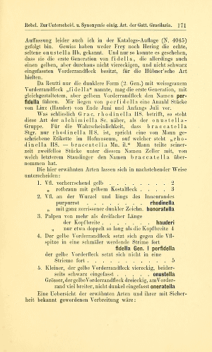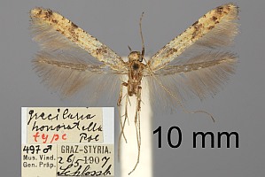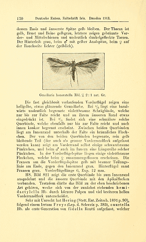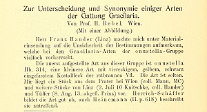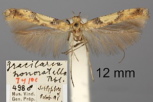 - Erstbeschreibung: Rebel, H. (1914): Zur Unterscheidung und Synonymie einiger Arten der Gattung Gracilaria. — Deutsche Entomologische Zeitschrift „Iris“ 27 (4): 168-172. Berlin (R. Friedländer & Sohn).