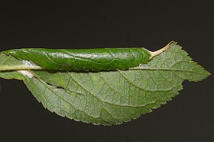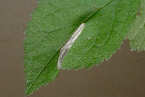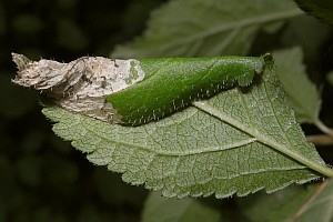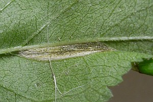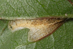 1: Verpuppungsgespinst unter umgebogener Blattspitze, Deutschland, Thüringen, Umgebung von Maua bei Jena, ca. 350 m, leg. Raupen an Schlehe (Prunus spinosa) 24. August 2009 (Foto am 28. August 2009: Heidrun Melzer), cult. & det. Heidrun MelzerForum