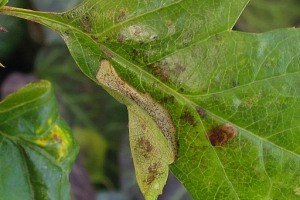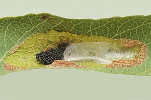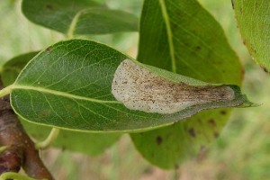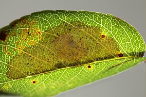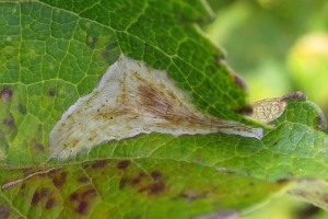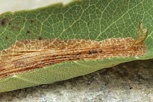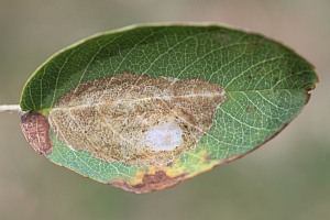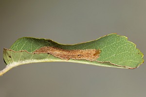 Die Minen an Felsenbirne unterscheiden sich etwas von jenen an den anderen Wirtspflanzen. Hering, E. M. (1957) beschreibt das recht ausführlich: „Mine beginnt als silberweißer, dann rostbräunlich verfärbter Gang-Platz, der sich gewöhnlich längs der Mittelripppe erstreckt. Später zeigt die Mine mehrere feine Längsfalten, die das Blatt so zusammenziehen können, dass es nach oben zusammenschlägt und die Mine nicht mehr sichtbar ist.“ Ergänzende Beobachtung durch Peter Buchner: Die obere Epidermis ist ausgesprochen derb und undurchsichtig, sodass selbst unter guten Durchlichtbedingungen das Erkennen der Raupe sehr schwierig ist. So war das unter [3] gezeigte Blatt von einer lebenden, aktiven Raupe besetzt, was aber erst nach langem Suchen mit der Lupe unter verschiedenen Blickwinkeln klar wurde. Auffällig an der rostbräunlich verfärbten Epidermis ist außerdem ein unscharf begrenzter weißlicher Fleck, der bei allen Minen an Felsenbirne vorhanden war, wenngleich nicht immer so deutlich wie bei der unter [2] abgebildeten.