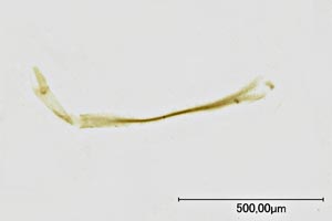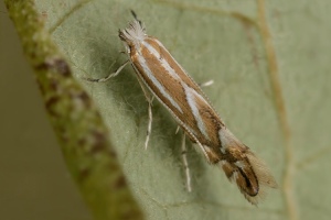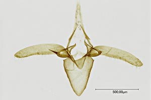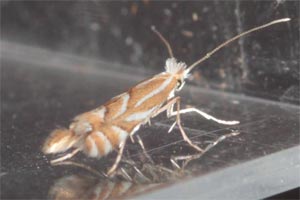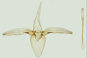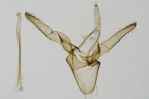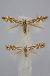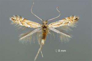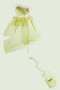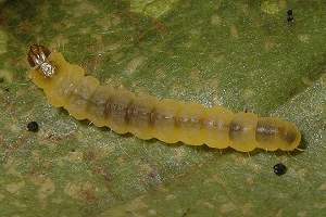 Puppe: Phyllonorycter esperella verpuppt sich im Herbst an einem Minen-Ende in einem zähen bräunlichweissen Kokon. Der Kot wird zuvor in einiger Entfernung vom Kokon in einem anderen Teil der Mine sorgfältig aufgehäuft. Die Puppe ist von gelbbrauner Färbung. (Autor: [Rudolf Bryner])