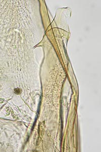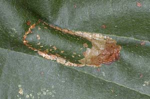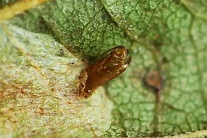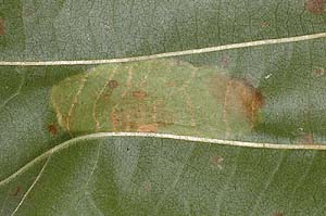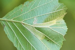 Mine: Die unterseitigen Minen, vorzugsweise an Alnus glutinosa, liegen in der Regel zwischen zwei Seitenrippen und nicht im Winkel zwischen Seitenrippe und Hauptrippe wie bei Ph. rajella. Sie sind durchschnittlich schmaler und kürzer als jene von Ph. froelichiella. Unterseits ist die Mine grünlich gefärbt und besitzt viele sehr feine Falten. Die gegen die Mittelrippe hin rötliche Färbung, welche bei den Minen von Ph. froelichiella oft zu beobachten ist, fehlt oder ist viel weniger ausgeprägt.