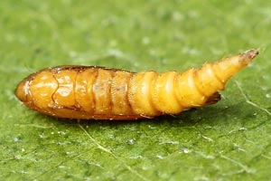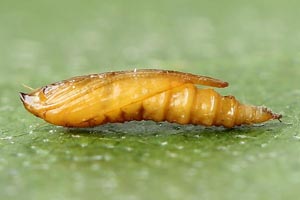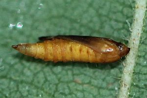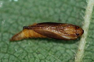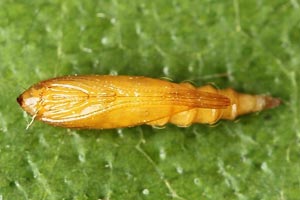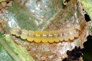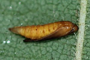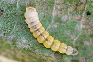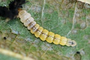 Raupe: Die erwachsene Raupe ist gelblichweiß gefärbt und besitzt einen hellbraunen Kopf. Die mittleren Segmente sind häufig etwas intensiver gelb, der Darmkanal scheint dunkler durch. Durch ihre helle, gelbliche Färbung lässt sie sich von den grauen bzw. dunkelgrauen Raupen von Ph. rajella und Ph. froelichiella unterscheiden. Die Raupen von Ph. strigulatella sind dagegen recht ähnlich; diese Art lebt aber (fast) ausschliesslich auf Alnus incana.