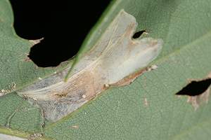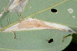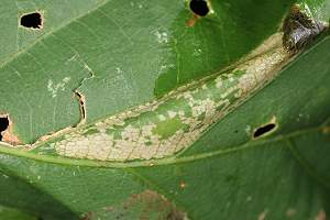 2: Raupe in unterseitiger Mine an Eichensprössling, Deutschland, Rheinland-Pfalz, Ober-Olmer Wald bei Mainz, 7. Oktober 2007 (manipuliertes Freilandfoto: Jürgen Rodeland), det. Jürgen Rodeland