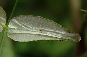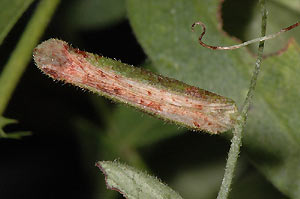 Mine: Die Minen von Ph. nigrescentella finden sich auf der Unterseite der Fiederblättchen (hier von Vicia sepium), welche sich dann oberseits rötlich verfärben und wie aufgebläht wirken. Gemäss Literatur sollen sich die befallenen Blättchen bei anderen Schmetterlingsblütlern zuerst weissfleckig und schliesslich ganz weiss verfärben, was ich bei Zaunwicke nie beobachten konnte. Vor der Überwinterung ist die Minenhaut auf der Blattunterseite noch hell gefärbt. Im Laufe des Winters verfärben sich die Minenunterseiten ebenfalls rötlich.