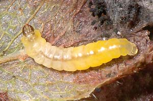 Puppe: Die Verpuppung erfolgte in den Zuchten jeweils etwa innerhalb der ersten 10 Tage, nachdem die Minen in Zimmertemperatur verbracht worden sind. Die Puppe ruht in einem weisslichen Gespinst im Zentrum der Mine.