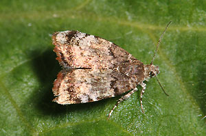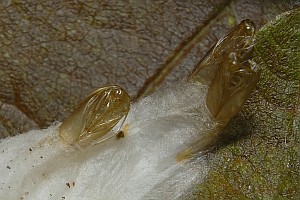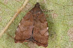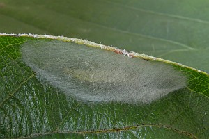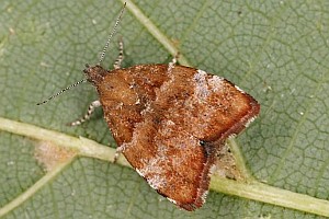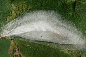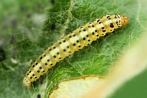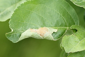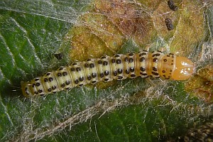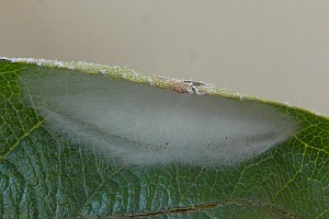 Schütze (1931) teilt zur Raupe mit: "In zwei Generationen auf den Blättern von Pirus malus [Malus domestica], weniger Pirus communis [Pyrus communis agg.] und Sorbus. Spinnt ein Blatt nach oben zusammen, doch bleibt es mehr oder weniger breit offen, schabt die Oberhaut ab, so dass die Blätter rotbraun werden. Verwandlung in schneeweißem länglichem Gespinst. An jungen Apfelbäumchen sind Ende August oft sämtliche Blätter skelettiert (Schütze). Auch hier bleibt unklar, wie gut die Angaben zum Birnbaum und zu Sorbus abgesichert sind - möglich sollten sie sein.
