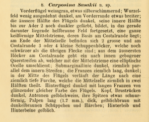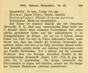 Rajaei & al. (2023: 197) bemerken zu einem angeblichen Vorkommen im Iran: “Carposina sasakii occurs in East Asia and is not recorded in West Asia (Diakonoff 1989: 69). The record of C. sasakii from Iran dates to before the description of the two endemic Iranian Carposinidae: C. ekbatana and C. roesleri. The name of the synonym C. persicana Sasaki, 1905 does not refer to ‘Persia’, but to the host-plant Prunus persica (peach).”