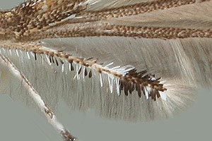 Mittelgrosse braune Art mit Gelbschimmer; schwarze Randbeschuppung der letzten Hinterflügelfeder erreicht die Federspitze und ist am Vorderrand kürzer als am Hinterrand, am Hinterrand vor und an der Federspitze durch weisse Schuppen unterbrochen.