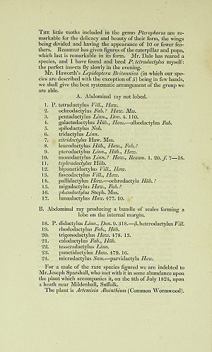 - Erstbeschreibung: Curtis, J. (1823-1840): British Entomology; Being Illustrations and Descriptions of the Genera of Insects Found in Great Britain and Ireland: Containing Coloured Figures from Nature of the Most Rare and Beautiful Species, and in Many Instances of the Plants upon which they are Found. Vol VI. Lepidoptera, Part II. — [Not paginated]. London (E. Ellis & Co.).