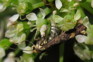 Die Raupen entwickeln sich gemäß Literatur in den Fruchtständen von Doldenblütlern (Apiaceae). Oben zeigen wir das Bild einer Eiablage an Wald-Engelwurz, der auch schon von Schütze (1931) angeführten Raupennahrungspflanze. Budashkin & Gaedike (2005) schreiben zusammenfassend: "Larvae in seeds of Peucedanum L., Angelica L., Heracleum L., Pimpinella L., and apparently on Ligusticum scoticum L. (Apiaceae). In Lapland the larva lives from July to September, the pupa overwintering (Koponen & Hurme 1986)."