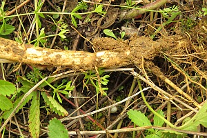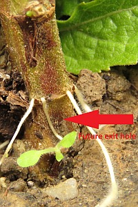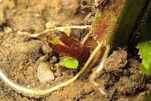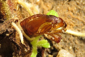 Ruben Meert weist darauf hin, dass hier die Puppe in der bewohnten Wurzel blieb und ein Ausschlupfloch vorbereitet hat, im Gegensatz zur Angabe in MBGBI ("In 'The Moths and Butterflies of Great Britain and Ireland' (Volume 5 / part 2, p. 20) is stated that the pupa of this species 'is spun up in the soil or amongst leaf litter.' In this case the pupa is clearly situated in the larval habitation (rootcrown) and the larva has made an exit hole.")